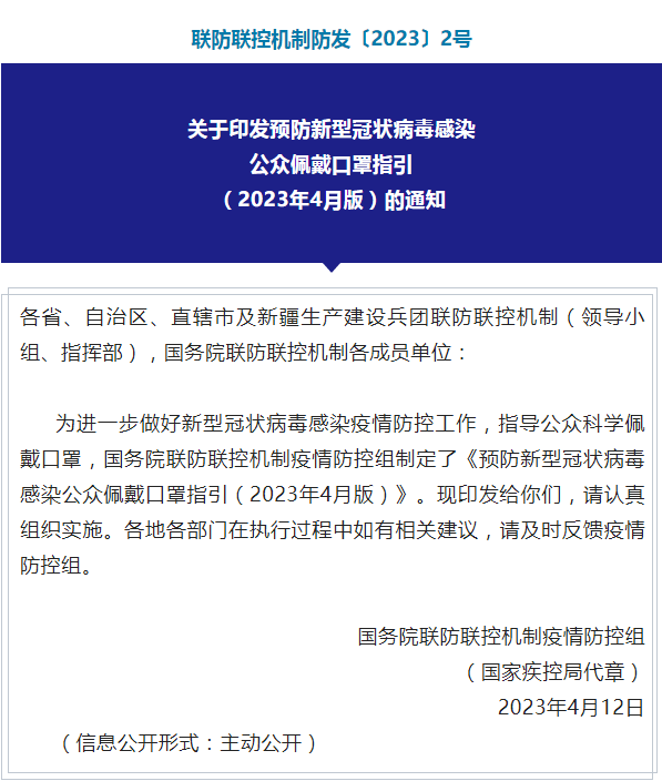 《预防新型冠状病毒感染公众佩戴口罩指引(2023年4月版)》