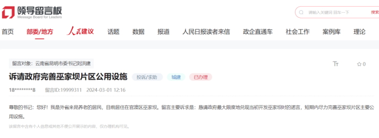 最近,昆明市人民政府国有资产监督管理委员会、昆明市住房和城乡建设局还对网友关心的巫家坝片区基础配套设施建设相关情况进行了回复:巫家坝片区规划新建道路46条,收储范围内可新建道路34条,目前已开工建设道路30条,已通车道路21条(含飞虎大道),满足了片区住户的出行及生活需求。在建道路9条,目前因施工单位资金链断裂,暂时处于停工状态,昆明城投公司将全力协调解决道路建设资金,尽快督促施工单位恢复施工。