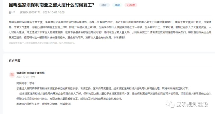 近日,有网友通过地方领导留言板咨询,昆明巫家坝保利南亚之窗大厦什么时候复工。官渡区住房和城乡建设局回复表示,经向开发企业了解,目前以保障住宅项目按时交付为主,已暂停施工,项目后续施工计划将由开发企业统筹安排。
