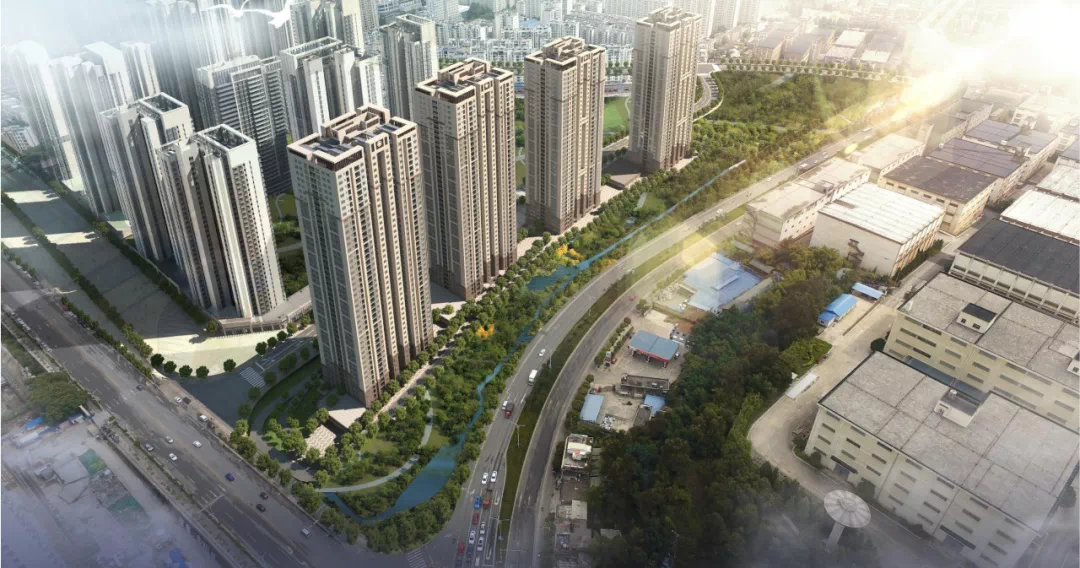 本项目位于昆明市五华区龙泉路和红园路交叉口东南侧,用地东临规划路,西临龙泉路,北临中天北城A1地块。本项目用地分为两个台地,地上拟建两栋39层高层住宅(含一层裙房),地下室与中天北城A1地块地下室连通,两个地块共设置三个机动车出入口。项目拟建地上建筑退让银汁河37.09米,地下室退让银汁河8.64米。