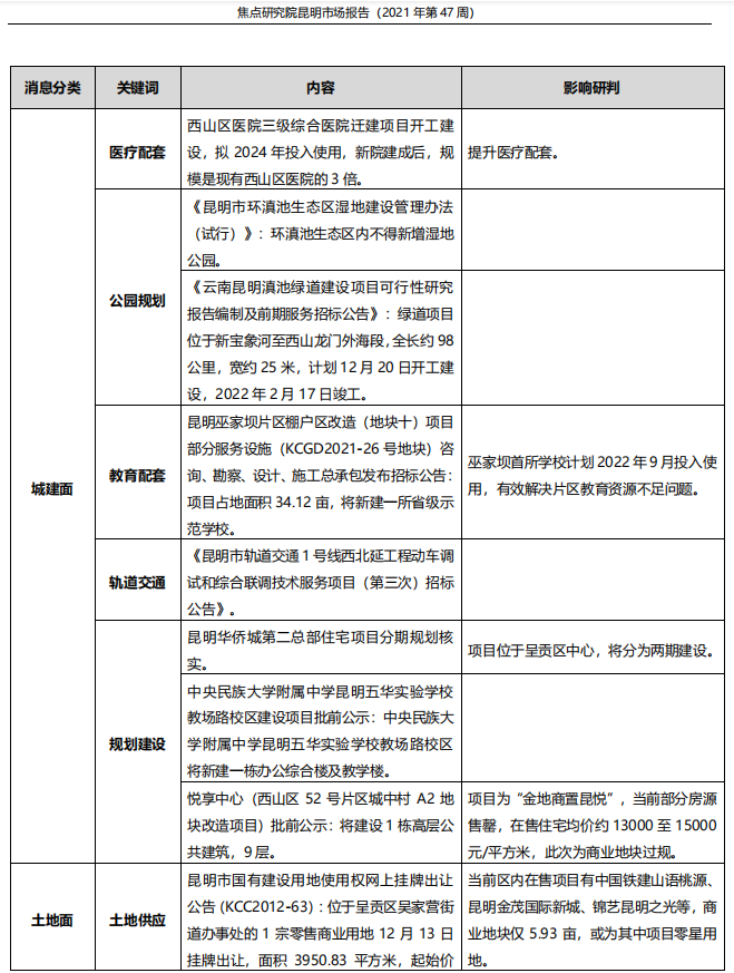 土地市场方面,当周主城3宗地块供应,占地面积约173.73亩,建筑面积32.65万平方米,其中,1宗零售商业用地位于呈贡,其他2宗商住用地位于经开区。