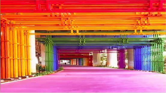 在高峣古渡浮桥旁,高海高速下方还隐藏着的一条别有风味的梦幻紫步道,整体以浪漫旖旎的紫色为主基调,全长近1.4公里,一路都是绚丽多彩的彩虹走廊,纵使是在炎炎夏日烈日当空,也是难得的清凉。