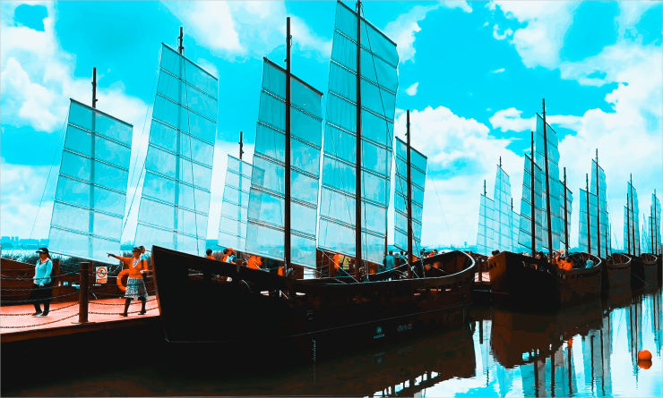 再往下一座长260米,宽4.5米的云南省首座钢浮桥浮于草海之上,浮桥呈纵向分支式排列,两边是帆船造型,中间铺设桥面,取百舸争流、千帆竞发之意。展现渔家码头场景和滇池渔文化。风起之时,63张风帆再次“扬帆起航”,生动再现了2000多年前“高峣古渡”百舸争流、千帆竞发的震撼风光,片片风帆点缀了滇池草海绿道,构成一道亮丽的风景线。