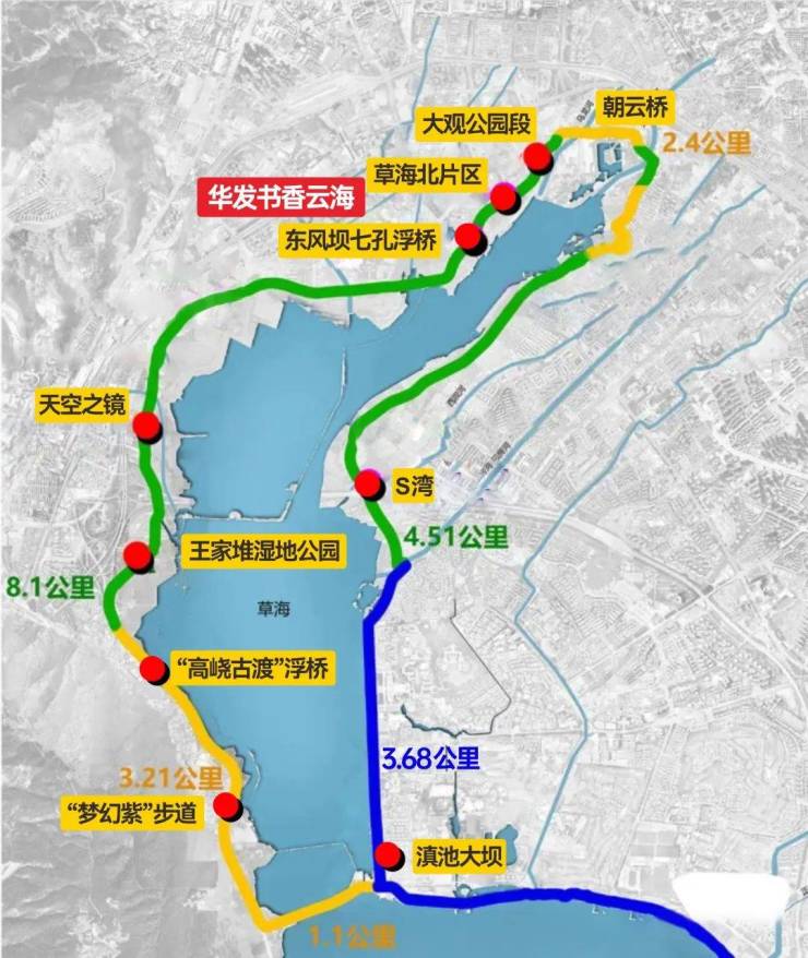 从地图上看环草海一条长约23公里,集生态观光、科普教育、休闲娱乐、文化体验于一体的生态绿道串联起了一城的自然生态和历史人文。接下来小编就带大家在草海北片区从“朝云桥”出发直至“梦幻紫”步道,一站式打卡藏在草海北岸的绝美网红打卡地。