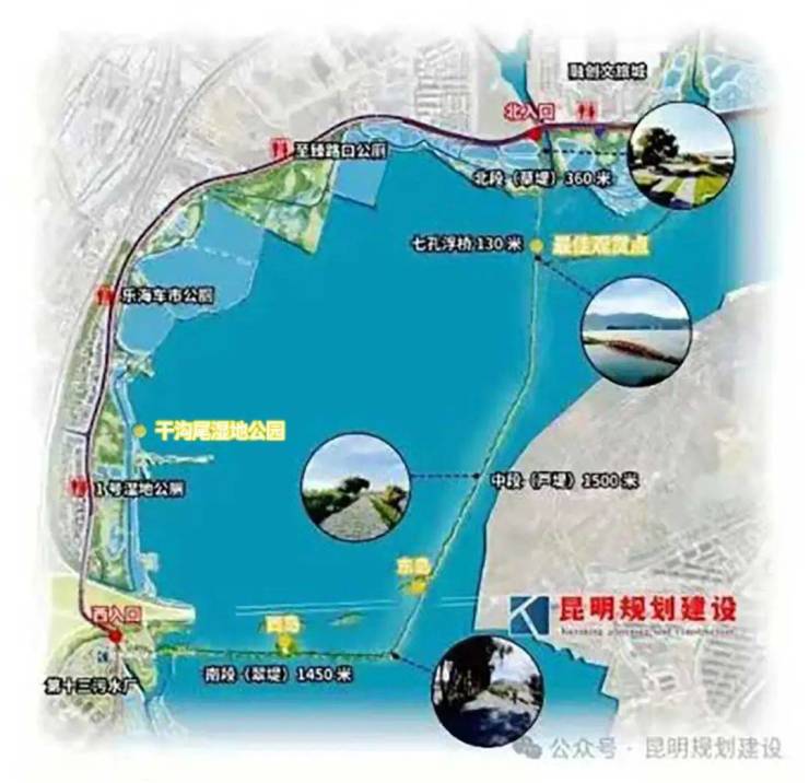 踏上堤坝,穿梭于滇池草海湖心绿水间,自西向东延伸,渐渐转向南北,途经翠堤、芦堤、七孔浮桥和草堤,身临其境回味“西眺美人、苹天苇地、翠羽丹霞、三春杨柳”的美感,更呈现“碧水青山映丹霞,柳岸苇堤迎翠羽”的自然美景。