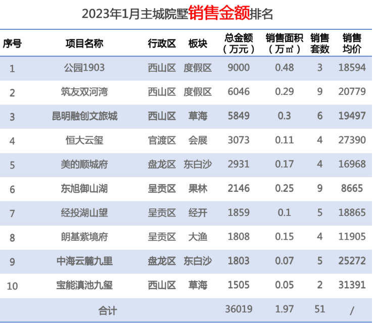 1月住宅销售,高性价比书香云海排名榜首,其次万科3项目皆排名前十,再次整体沿滇北岸、度假区、低密项目再度热销,前十占比近一半。1月非住成交集中为建投滇SHOW、碧桂园玺台、俊发春之眼等非常规性备案。
