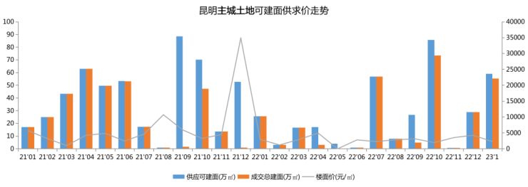 2023年1月昆明主城累计成交计容55.25万㎡,环比上涨91%。