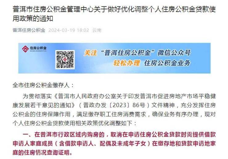 普洱发布《普洱市人民政府办公室关于印发普洱市促进房地产市场平稳健康发展若干意见的通知》,取消在申请住房公积金贷款时需提供借款申请人家庭成员在缴存地和贷款申请地家庭的住房情况查询证明;实行二套房与首套房同等最高贷款额度(个人住房公积金贷款最高额度60万元,夫妻双方70万元);取消提取和贷款间隔时限,开展即提即贷业务等。
