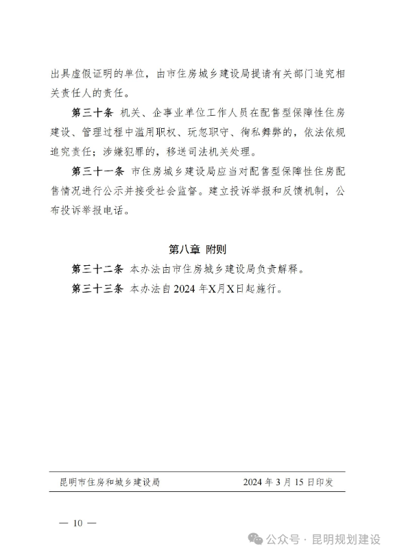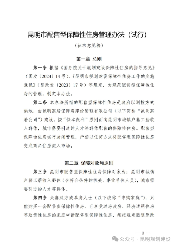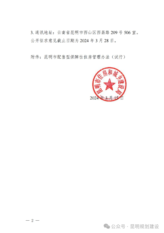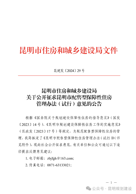 3月15日,昆明市住房和城乡建设局发布《关于公开征求昆明市配售型保障性住房管理办法(试行)意见的公告》。