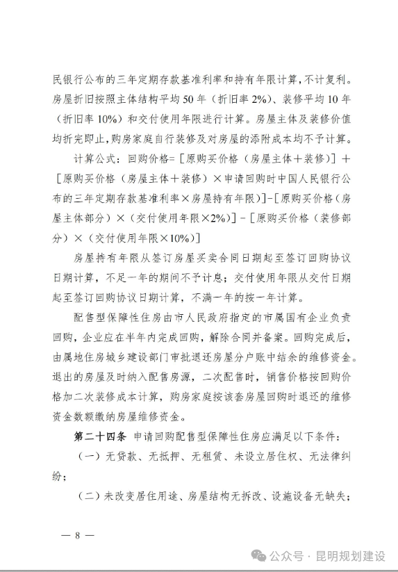 配售型保障性住房回购价格按照原购房款+利息-房屋(主体结构及装修)折旧的原则核算。利息按照签订回购协议时中国人民银行公布的三年定期存款基准利率和持有年限计算,不计复利。