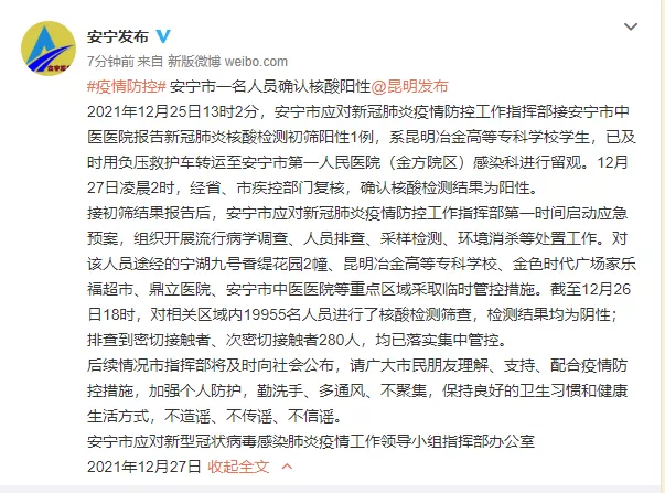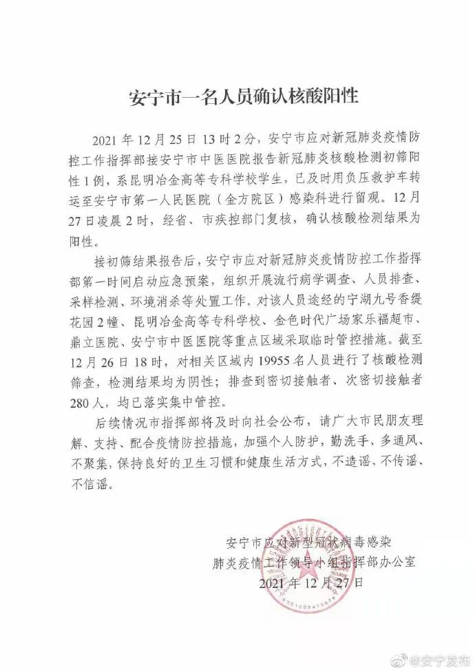 2021年12月25日13时2分,安宁市应对新冠肺炎疫情防控工作指挥部接安宁市中医医院报告新冠肺炎核酸检测初筛阳性1例,系昆明冶金高等专科学校学生,已及时用负压救护车转运至安宁市排名前列人民医院(金方院区)感染科进行留观。12月27日凌晨2时,经省、市疾控部门复核,确认核酸检测结果为阳性。