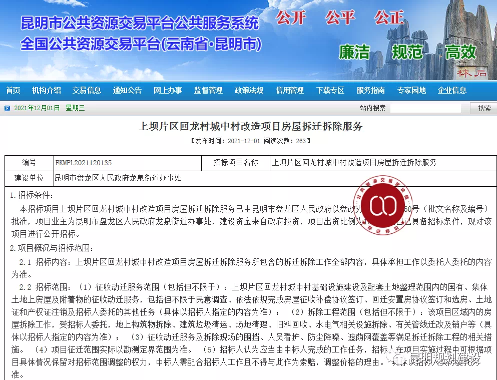 12月1日,昆明市公共资源交易中心发布《上坝片区回龙村城中村改造项目房屋拆迁拆除服务招标公告》,根据公告,该项目总投资4亿元,位于昆明市盘龙区龙泉街道办事处辖区。