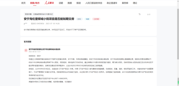 今年7月,海伦堡倾城小院项目业主在人民网地方领导留言板咨询项目是否能如期交房,因为“迟迟不见项目动工,还听说无法办理房产证”。