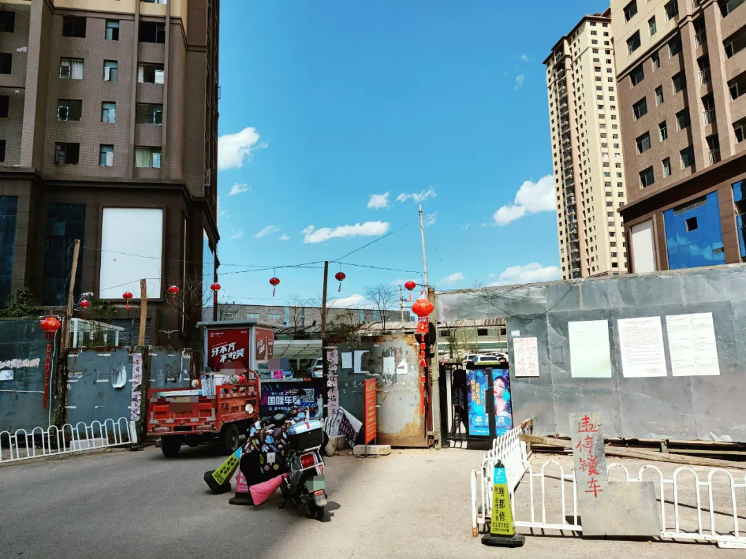 从外面可以看到,有人住在里面,一些窗子安装了窗帘,还贴了窗花。小区入口处设置了道闸,门两边挂着红灯笼,业主和车辆进进出出。