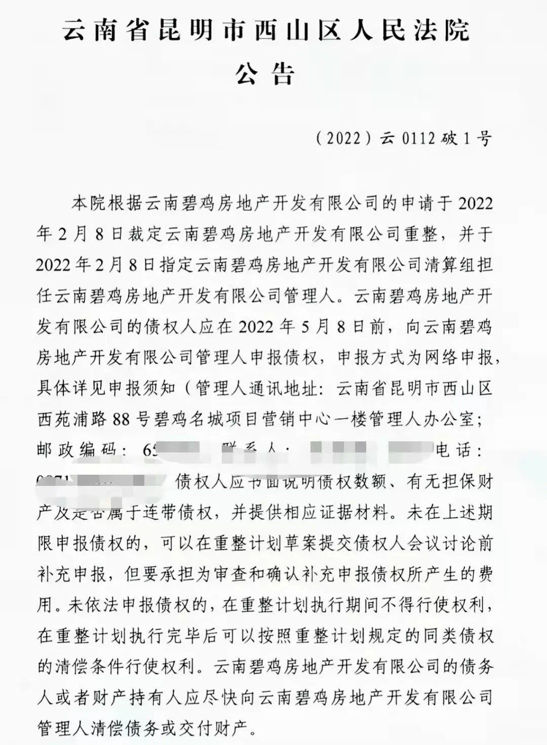 2月14日,西山区人民法院发布公告称:云南碧鸡房地产开发有限公司已于2月8日裁定重整,提醒公司债权人在5月8日前申报债权。