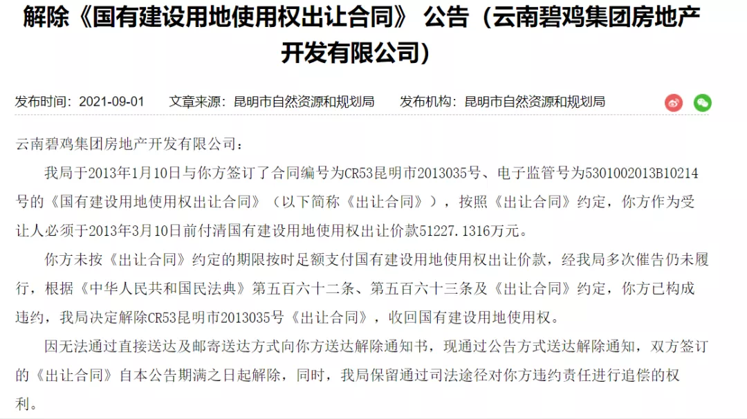 2021年9月,因欠缴土地出让款多年,昆明市自然资源和规划局发布解除“国有建设用地使用权出让合同”公告,将云南碧鸡集团房地产开发有限公司和另外两家地产公司的土地使用权收回。