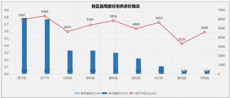 热点郊县:安宁主城、太平及嵩明均量价齐跌;晋宁区低价走量,量升价跌。