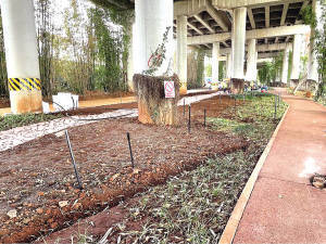 昨天,施工队正在对自行车道与人行道之间的绿化带小溪铺筑石块。据悉,小溪上方正是高海高速两幅桥面之间的30厘米缝隙,降雨可从缝隙流入小溪,滋润绿化带。据现场施工负责人介绍,本月底即可完成自行车道彩色沥青的铺筑,人行道保留3年前已经铺筑好的棕色沥青路面,同时绿化也已完工,但明年初暂时还不开放,要等浮桥3月底建设完毕后再一同开放。