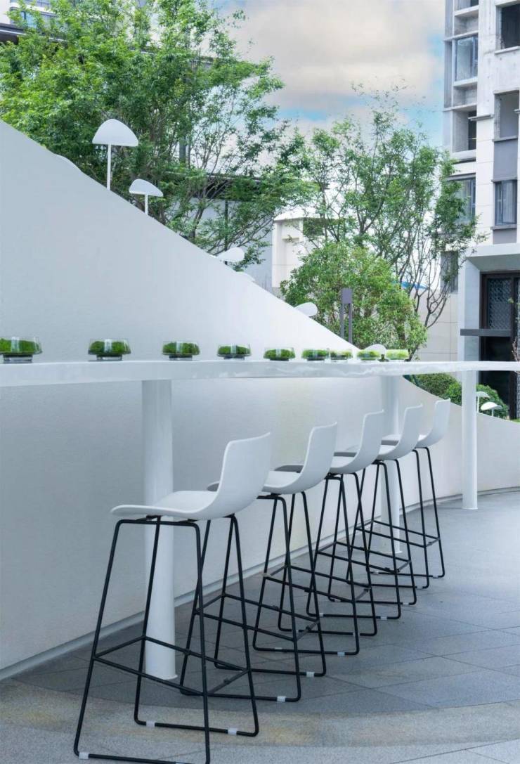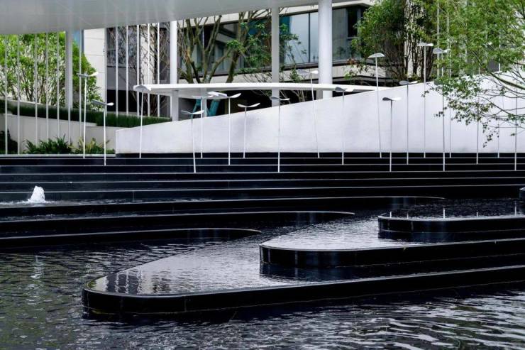 池水顺流而下,层层叠叠,水波潋滟,池边以草木点缀铺装,杉林步道深处传来婉转动听的鸟叫与虫鸣,让疲于喧嚣的心灵回归生活原本的意境。