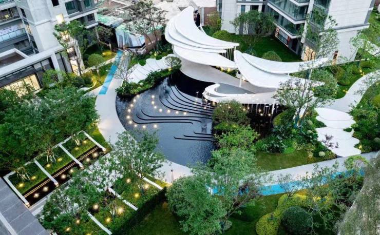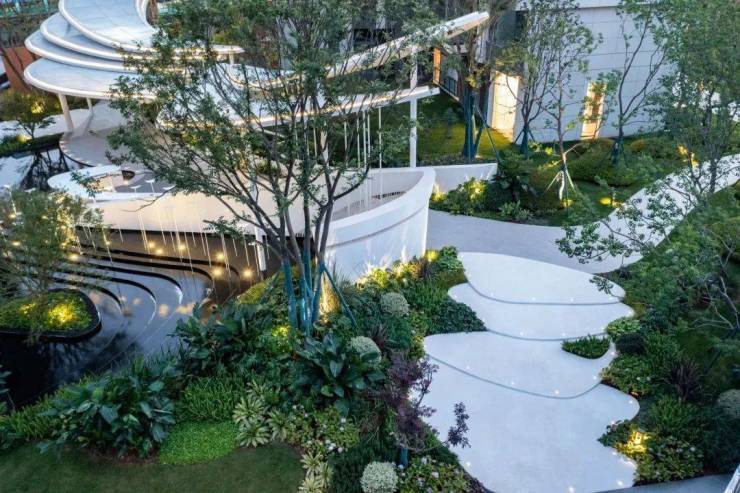 不远处,云镜亭的白与叠级水景的黑相互映衬,还原生活的无数憧憬与幻想。一旁的花镜走廊错落有致,弥漫着梦想和生活的芬芳。