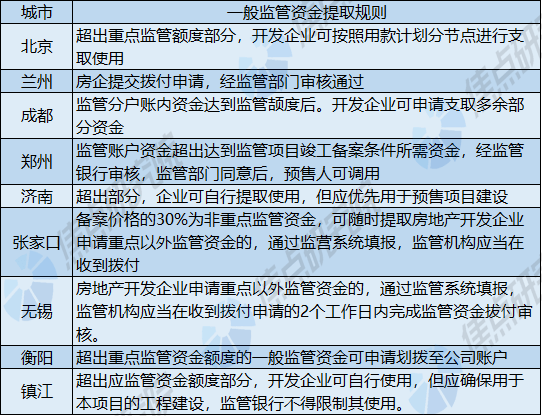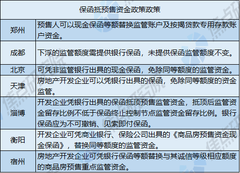 部分城市提出了适度的保函代替政策。济南、无锡和珠海允许使用保函(保函是指银行根据客户的申请而开立的有担保性质的书面承诺文件,如果申请人未履行约定义务时,由银行履行担保责任)替代一定的监管额度,但是需要根据企业的信用和财务状况制定不同的标准,优质信用企业部分或全部支取节点的监管资金留存比例可以下调。