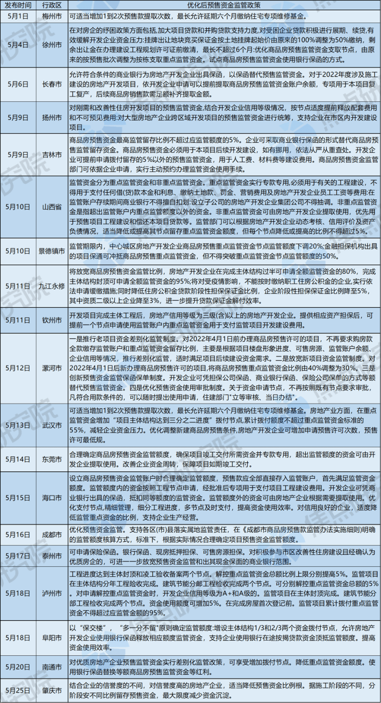预售资金监管政策出台的初衷是为了防止项目资金挪作它用,但是部分城市设置标准过于严苛,反而导致项目面临较大风险,出于经济维稳的需求,出现了不同程度的纠偏政策。4月29日召开的中共中央政治局会议强调,支持各地从当地实际出发完善房地产政策,支持刚性和改善性住房需求,优化商品房预售资金监管,促进房地产市场平稳健康发展。5月以来,预售资金放松政策明显变多,据焦点研究院不完全统计,累计有19个省市发布预售资金监管政策,在此之前,仅南京、烟台、和绵阳等5城放松预售资金监管。