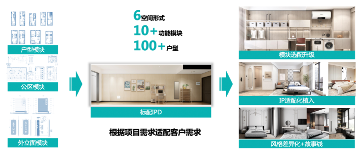 IPD集成生产30多种模块100余种定制户型;大体量项目装修比传统做法缩短3个月;完备的EPC装配式产业链闭环。
