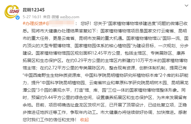 据昆明市人民政府办公室官方微博@昆明12345 的消息,近日,有网友通过微博询问“关于国家植物博物馆修建进度的问题”。