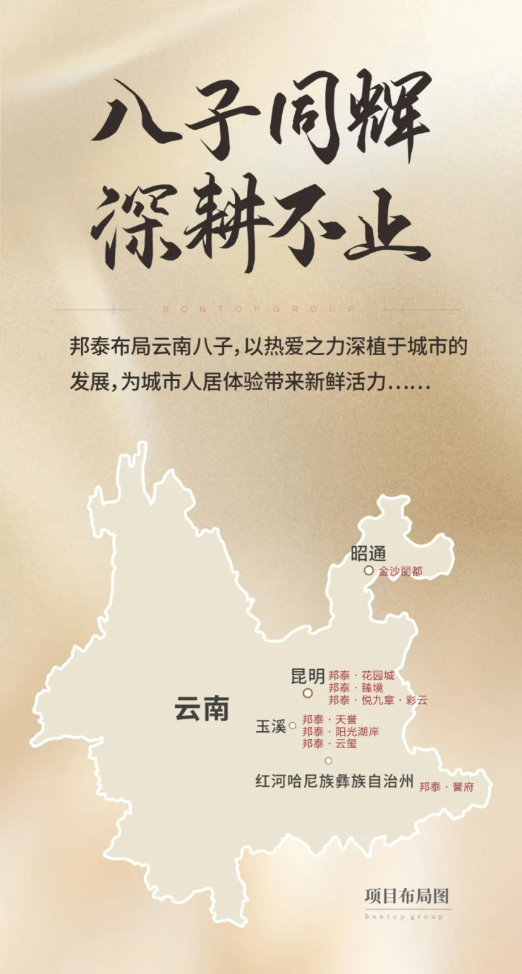 邦泰进驻云南,以先入地州再进昆明的战略稳步推进。目前,玉溪已有高铁新城的邦泰·天誉、邦泰·云玺、抚仙湖旁的邦泰·阳光湖岸3个项目;红河建水邦泰·誉府1个项目;昭通金沙丽都1个项目,加上昆明的4个项目,目前,邦泰在云南已布局9个项目。