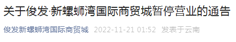 根据疫情防控最新要求以及最新形势发展,为保护消费者、商户及商户雇员的健康,减少因人员聚集带来的疫情传播风险,俊发·新螺蛳湾国际商贸城时尚潮流馆一期、时尚潮流馆二期、云品馆、家居生活馆、滇忆465、仓储区将于2022年11月21日08:00起至2022年11月25日24:00止暂停营业五天,进行全面环境卫生清洁和消杀工作。若有其它变动,请关注俊发新螺蛳湾国际商贸城公众号或向各期市场工作人员联系咨询。