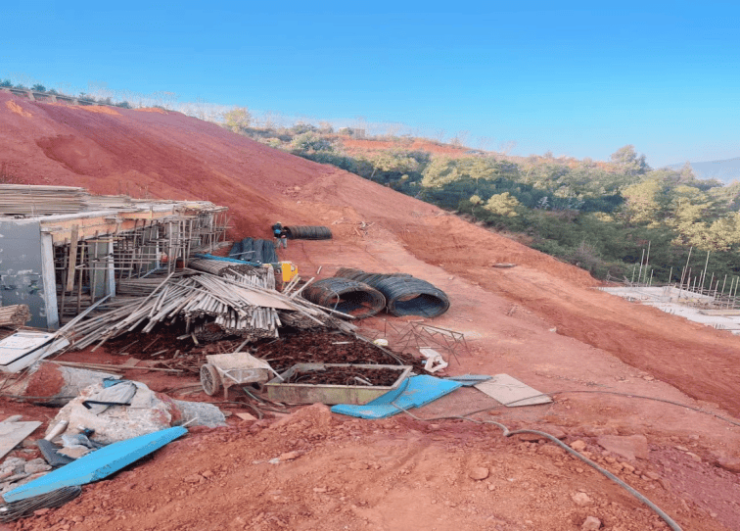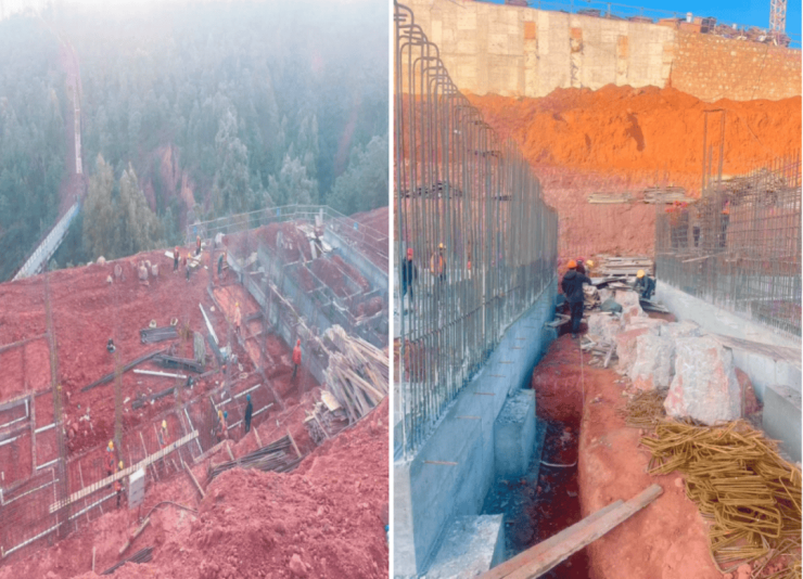 11栋基础施工完成。1层模板支撑体系搭设。水电预埋,挡土墙钢筋安装。