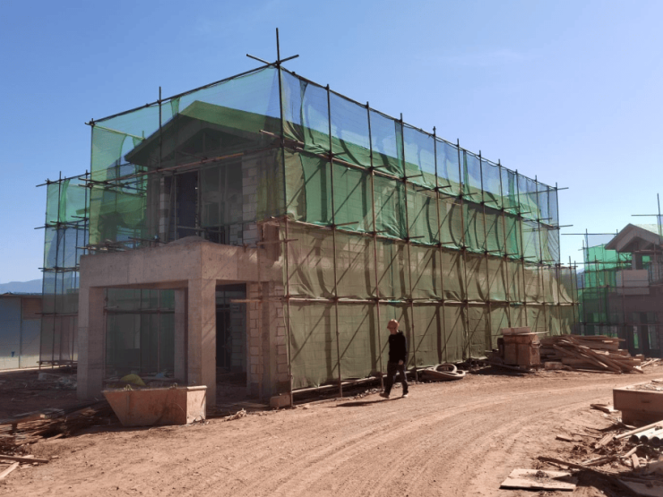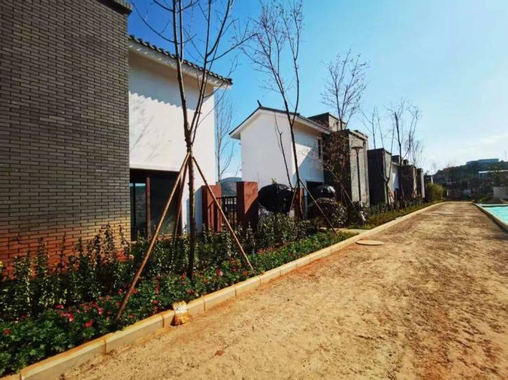 18栋主体已完成、外墙涂料已完成、屋面瓦已完成,庭院院墙完成,入户门完成。栏杆安装完成、室外管网埋设完成、室外景观完成;