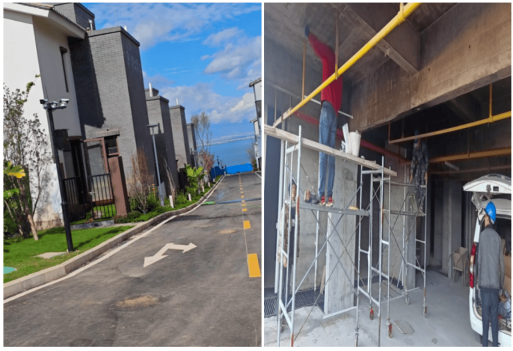 1栋砌体完成,内墙抹灰完成,外墙抹灰完成,屋面防水完成,露台防水完成,屋面瓦施工完成100%;窗框安装完成100%;栏杆安装完成100%;外墙腻子完成100%,外墙平涂漆完成100%,室外雨污水管网完成100%。室外给水管道完成100%;外墙排水管未安装,室内给排水、二配安装完成。