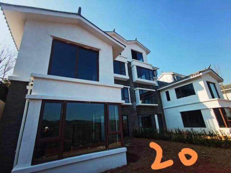 20栋主体已完成、外墙涂料已完成、屋面瓦已完成,庭院院墙完成,入户门完成。栏杆安装完成