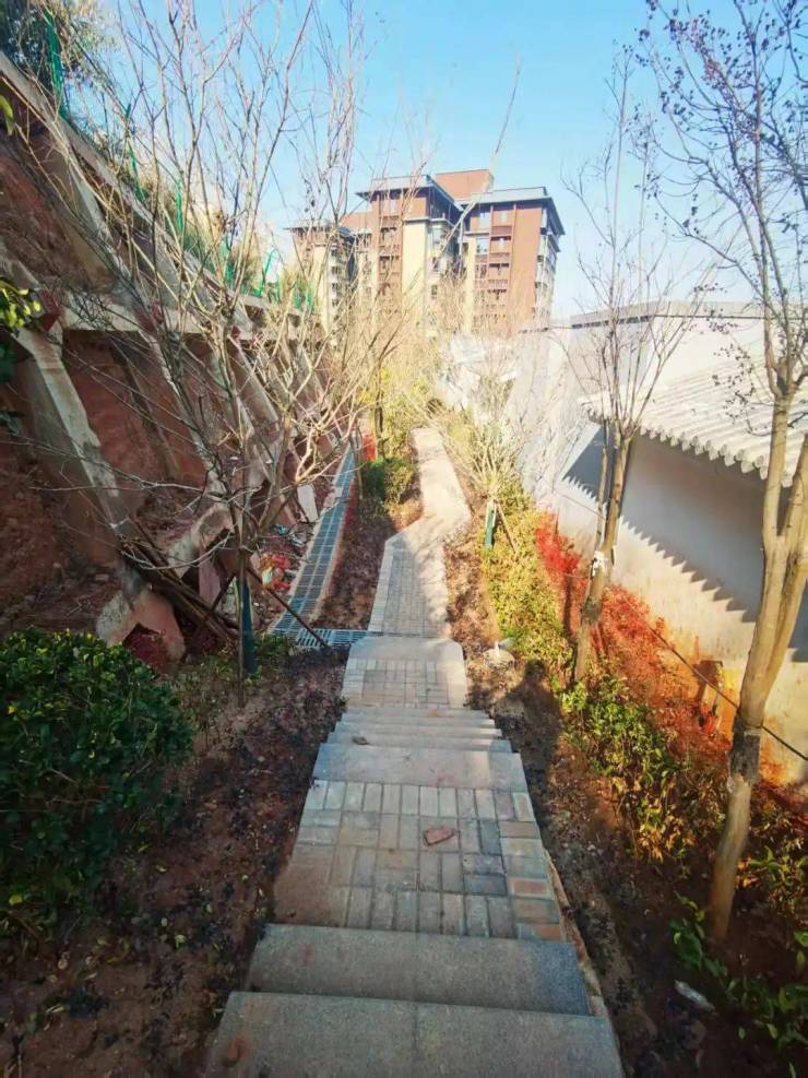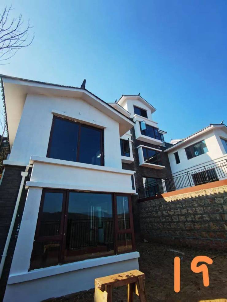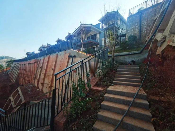 19栋主体已完成、外墙涂料已完成、屋面瓦已完成,庭院院墙完成,入户门完成。栏杆安装完成、室外管网埋设完成、室外景观完成;