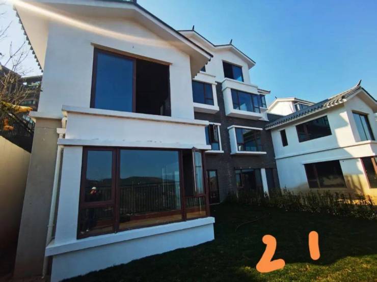 21栋主体已完成、外墙涂料已完成、屋面瓦已完成,庭院院墙完成,入户门完成、栏杆安装完成、室外管网埋设完成、室外景观完成;