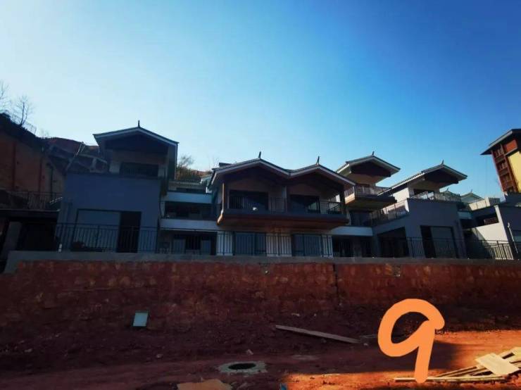 9栋主体封顶完成、砌体完成,内墙抹灰完成,外墙抹灰完成,屋面防水完成,腻子完成100%,露台压顶小青砖完成100%,窗框及固定玻璃安装完成,屋面盖瓦完成,室内二次电管网配管完成,给排水管安装完成,露台栏杆安装完成,涂料完成,外架拆除完成,室外钢楼梯安装完成,室外附属工程施工中;