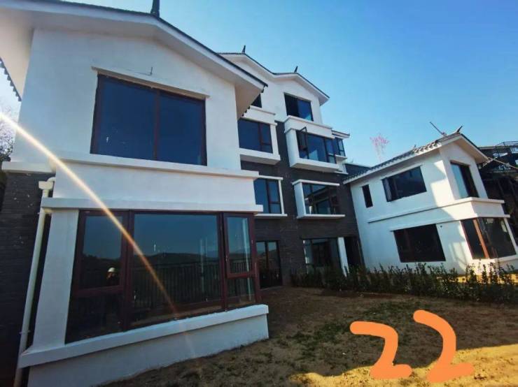 22栋主体已完成、外墙涂料已完成、屋面瓦已完成,庭院院墙完成,入户门完成。栏杆安装完成、室外管网埋设完成、室外景观完成;