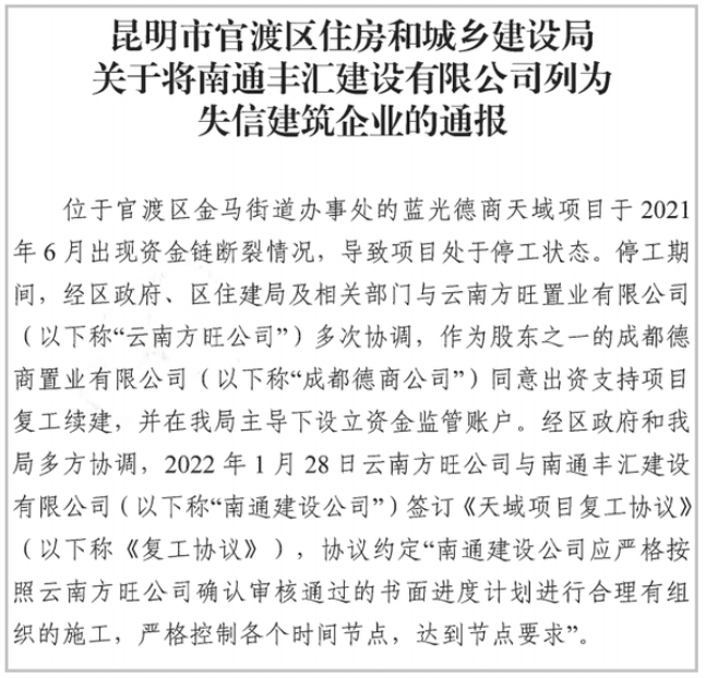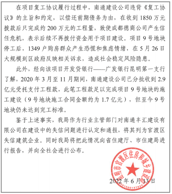目前,南通汇丰建设已被昆明官渡区住建局列为失信企业。