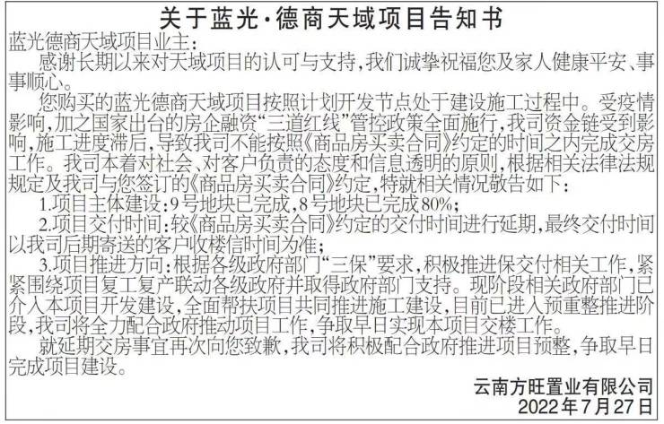 昆明蓝光·德商天域发布延期交房告知书