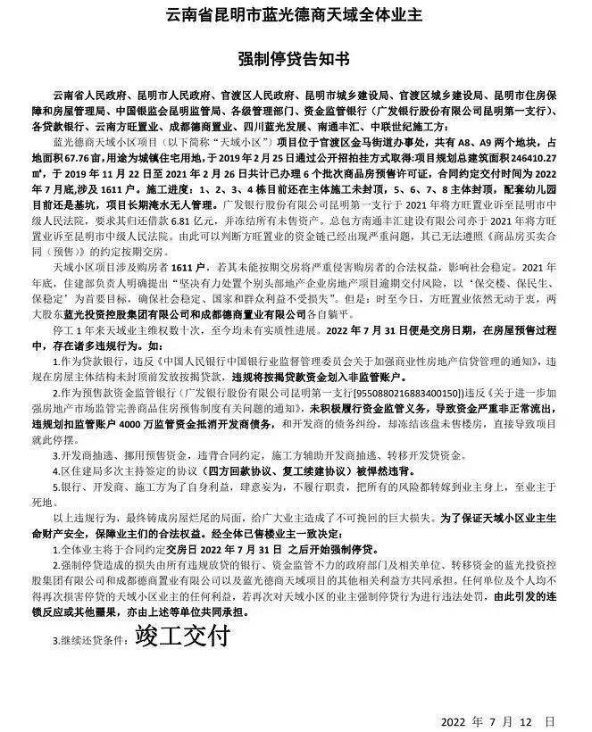 此前,昆明排名前列宣布“停贷项目”就是蓝光·德商天域,业主于7月12日发布《云南省昆明市蓝光德商天域全体业主强制停贷告知书》,项目已停工一年左右,业主组织维权数十次,均未有实质性进展。为了维护业主合法权益,将于交房日开始停贷,继续还贷条件是竣工交付。