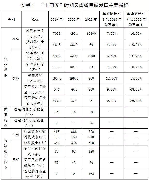 ——运输服务能力显著增强。到2025年,全省航线数量达到750条,通航城市达到210个。昆明机场航线数量达到500条,其中国际航线突破120条,国际和地区通航城市超过70个;洲际直飞航线(含货运)突破5条,力争达到10条;引进1—2家基地货运航空公司。