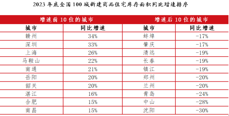 截至2023年底,全国百城中有32个城市库存出现了同比正增长,占比三成。