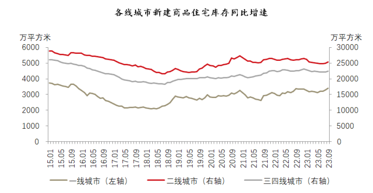 分城市能级来看,全国百城中一、二、三四线的新建商品住宅库存总量分别为3568万平方米、24575万平方米和22375万平方米,相比2022年底增速分别为6.2%、-7.5%和3.2%。从城市结构看,一线城市的库存拉升态势较为明显,这和一线城市购地及新开工市场平稳、房源供应充足等有关。尤其是2023年下半年一线城市出台了各类楼市利好政策,房源供应频次明显增加。