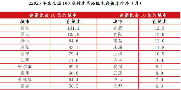 截至2023年底,全国百城平均存销比为22.4个月,其中一、二、三四线的新建商品住宅存销比分别为16.7个月、19.2个月和29.5个月。总体上来看,一线城市去化周期相对好,二线城市居中,而三四线城市最长。