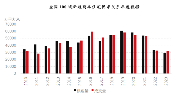 2023年,全国100个城市新建商品住宅供应量为29112万平方米,成交量为31652万平方米,呈现出“供小于求”的态势。