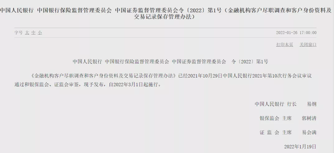 红星资本局1月31日消息,近日,中国人民银行、中国银行保险监督管理委员会、中国证券监督管理委员会三部门联合印发《金融机构客户尽职调查和客户身份资料及交易记录保存管理办法》(下称《办法》)。《办法》自2022年3月1日起施行。