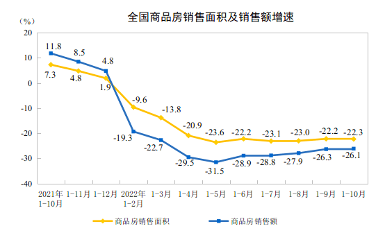 今年前10月,全国商品房销售面积111179万平方米,同比下降22.3%,其中住宅销售面积下降25.5%;商品房销售额108832亿元,下降26.1%,其中住宅销售额下降28.2%。