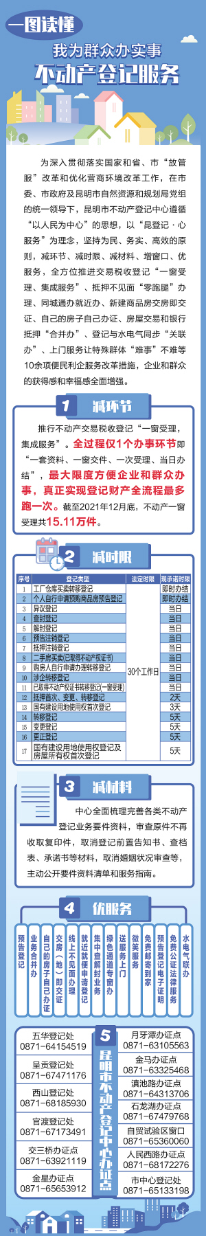 全过程仅1个办事环节,即“一套资料、一窗交件、一次受理、当日办结”,较大限度方便企业和群众办事,真正实现登记财产全流程只跑一次。不动产登记办理时间不断压缩的背后,是昆明在集成办理、流程再造等方面的持续改革创新。2019年9月起,推出不动产登记和水、电、气 “一门通办”到网上登记大厅水电气同步过户。实现“部门后台数据跑路”替代“办事群众跑路”,压缩联办时限并当日办结。