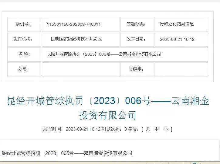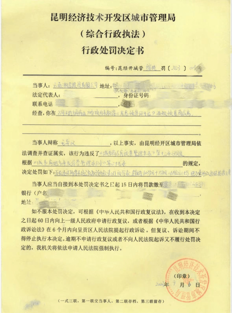 这份编号为昆经开城管综执罚【2023】006号的处罚决定书显示:云南湘金投资有限公司天地方舟商业广场项目未取得房屋预售许可证,违规预售商品房,违反了《城市商品房预售管理办法》第十三条的规定。
